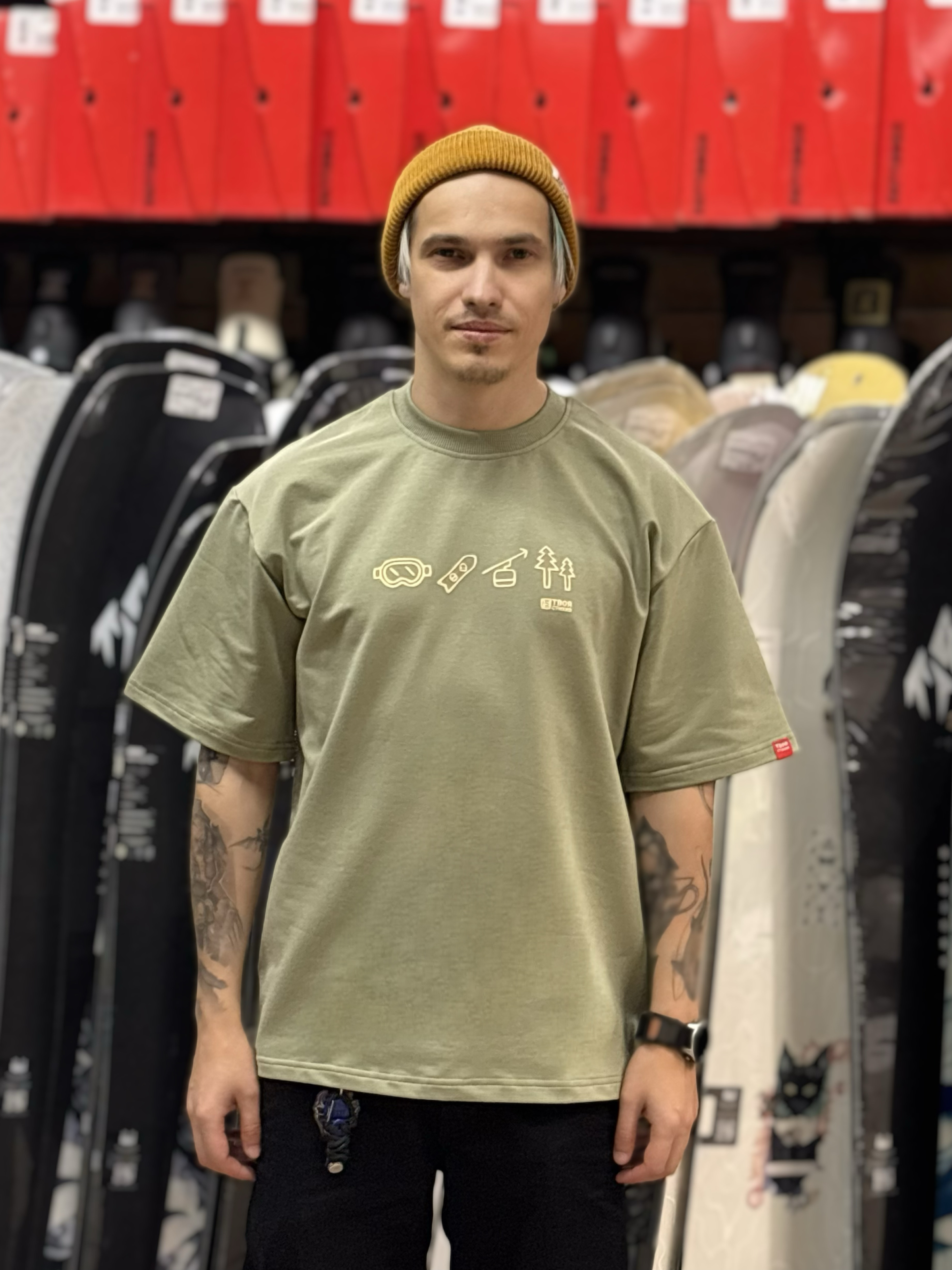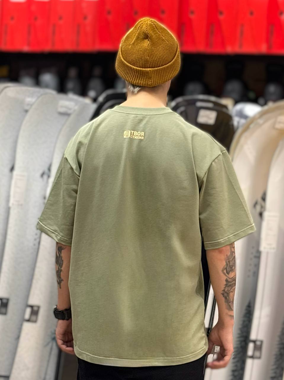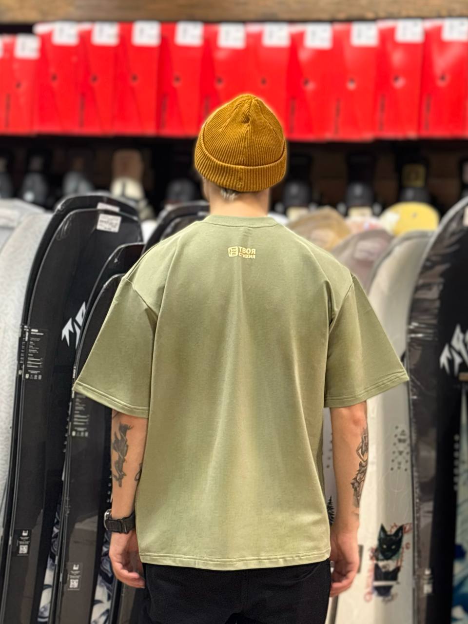 Оверсайз-футболка хаки с минималистичным принтом, символизирующим 4 стихии. Идеальный выбор для поклонников сноубординга - стиль, комфорт и философия приключений в одной вещи!»