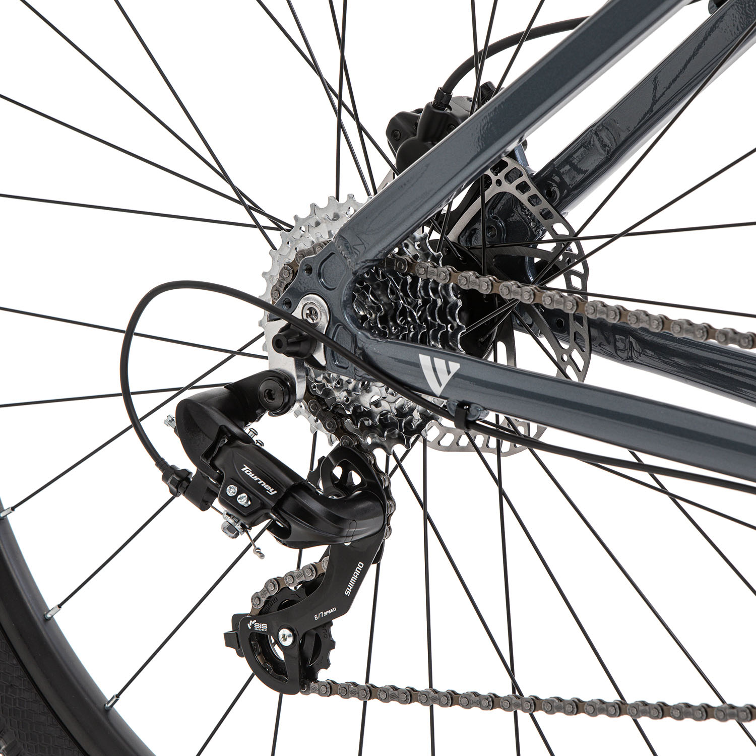 Велосипед оснащен 7-скоростной трансмиссией Shimano Tourney, предлагающей все преимущества начальной серии с качественными комплектующими. Несмотря на 7 скоростей, модель оборудована кассетой для большей практичности, малого веса и долговечности. Кроме того на велосипеде используются раздельные детали: тормозная ручка и манетка. Это позволит вам менять один компонент без замены второго и установить оборудование более высокого класса. Модель собрана на дисковых гидравлических тормозах для четкой и безопасной остановки в любых погодных условиях, надежных двойных ободах и втулках с промышленными подшипниками для плавного хода, лучшего наката и легкого педалирования.