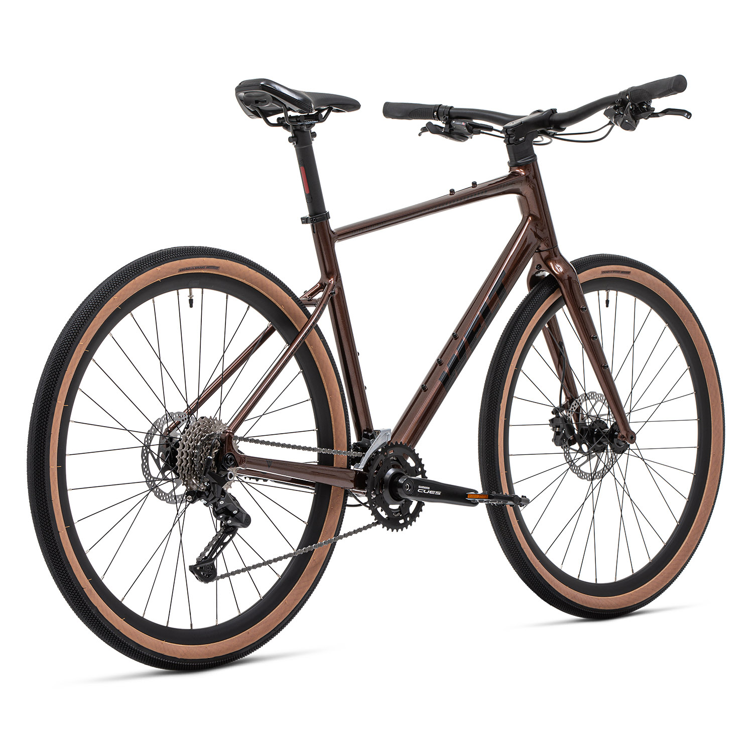 Трансмиссия Shimano CUES с двумя звездами (40/26T) и кассетой 11–36T (9 скоростей) позволяет гибко подбирать передачу — от быстрой езды по проспекту до уверенного подъёма на холм. Гидравлические тормоза Shimano -200 с увеличенным передним ротором 180 мм и стандартным задним 160 мм обеспечивают надёжный контроль при торможении даже в дождь или на мокром асфальте.