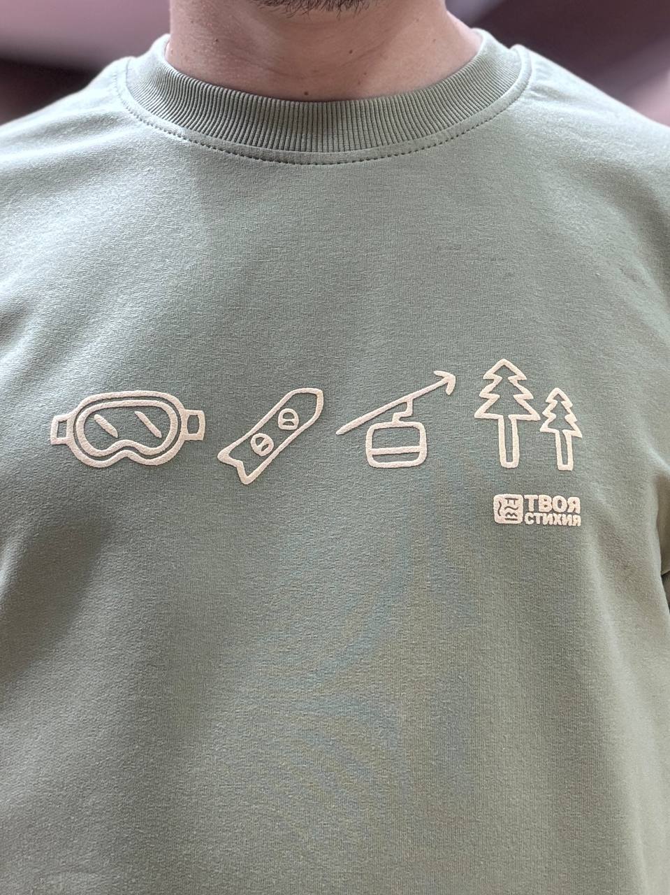 Оверсайз-футболка хаки с минималистичным принтом, символизирующим 4 стихии. Идеальный выбор для поклонников сноубординга - стиль, комфорт и философия приключений в одной вещи!»