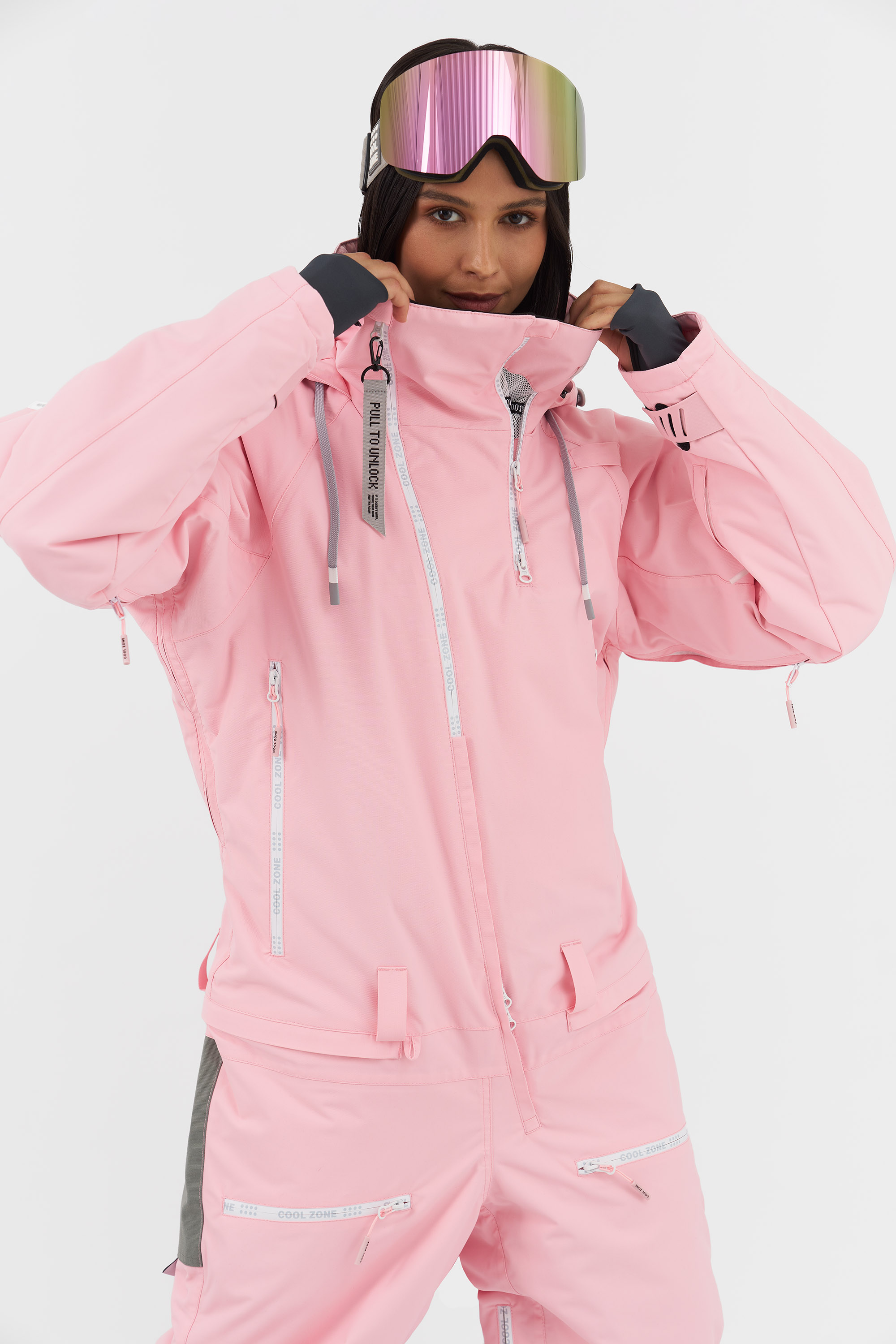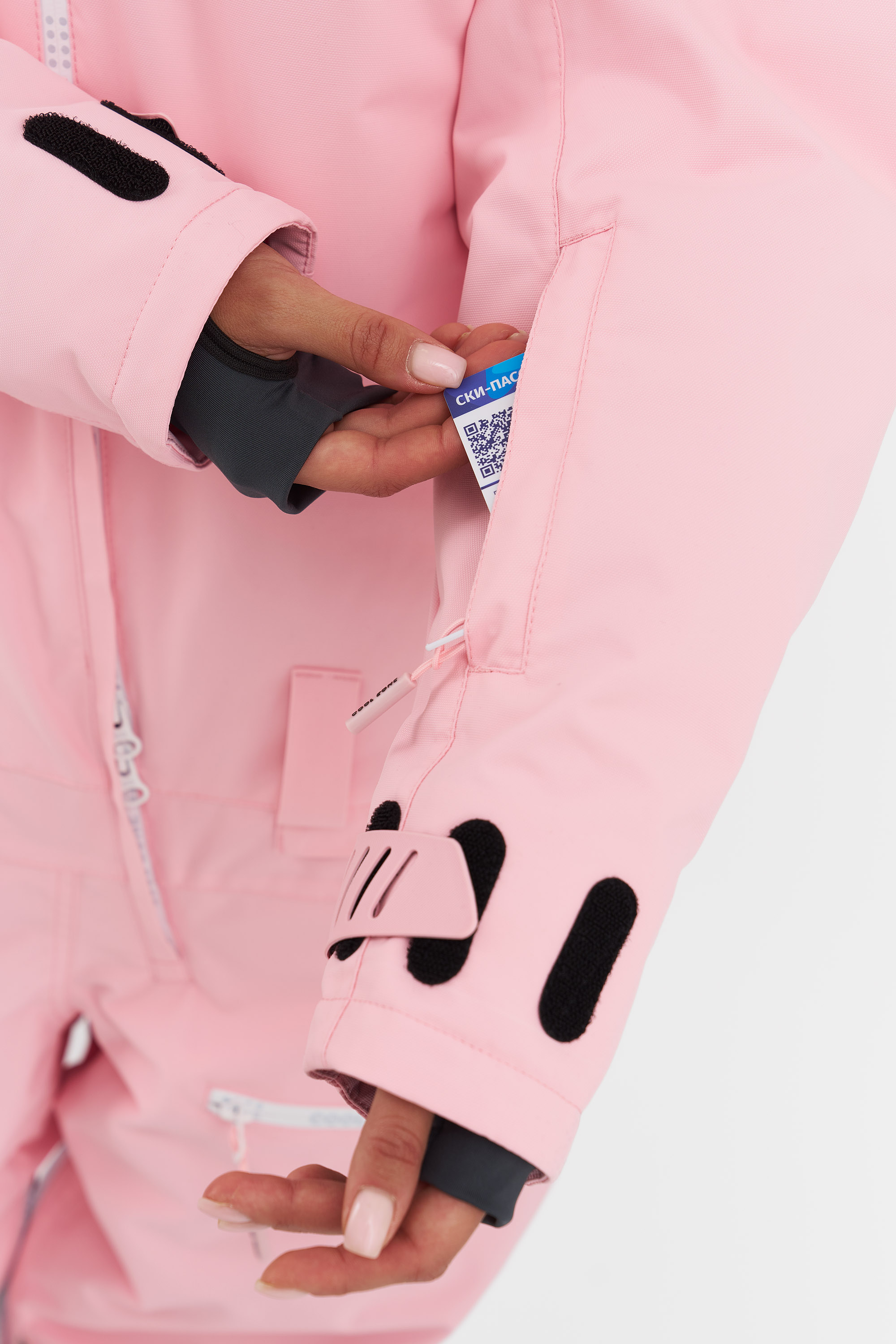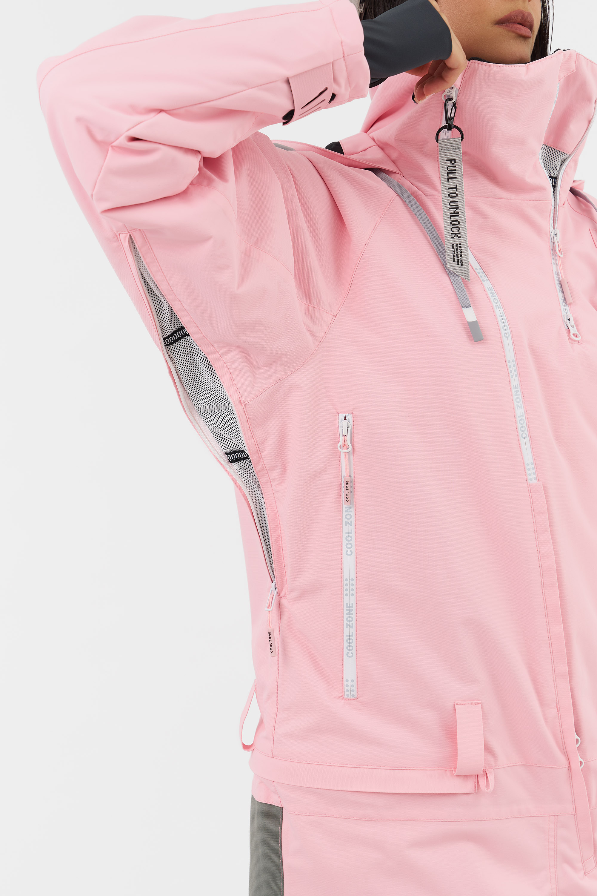 Внутренние липучки возле центральной молнии позволяют закрепить специальный элемент для вывода крюка от трапеции, а тройной бегунок на основной молнии даёт возможность надеть трапецию под комбинезон. Это решение предотвращает задувание ветра и попадание снега внутрь. (Специальная деталь продаётся отдельно.)