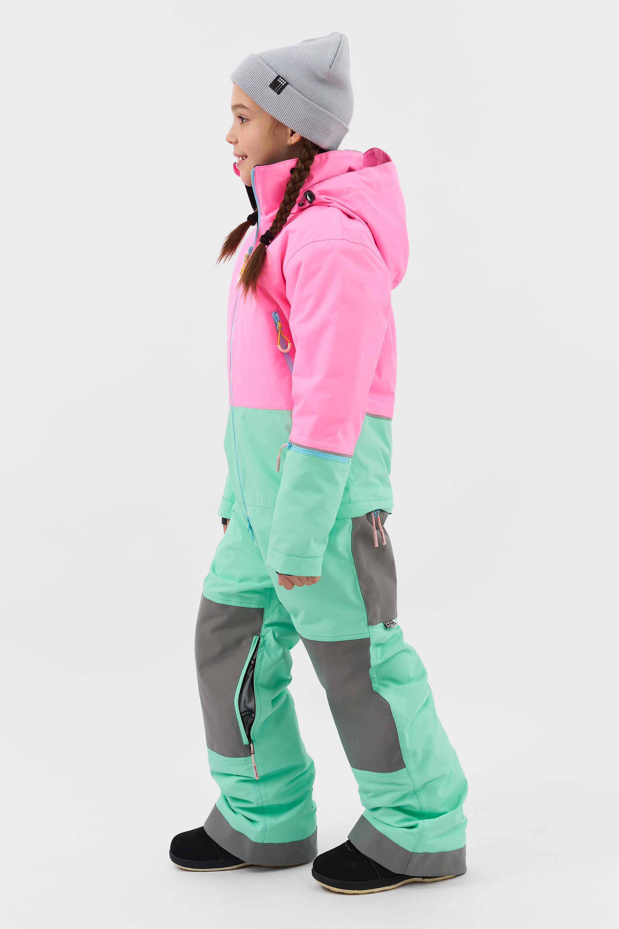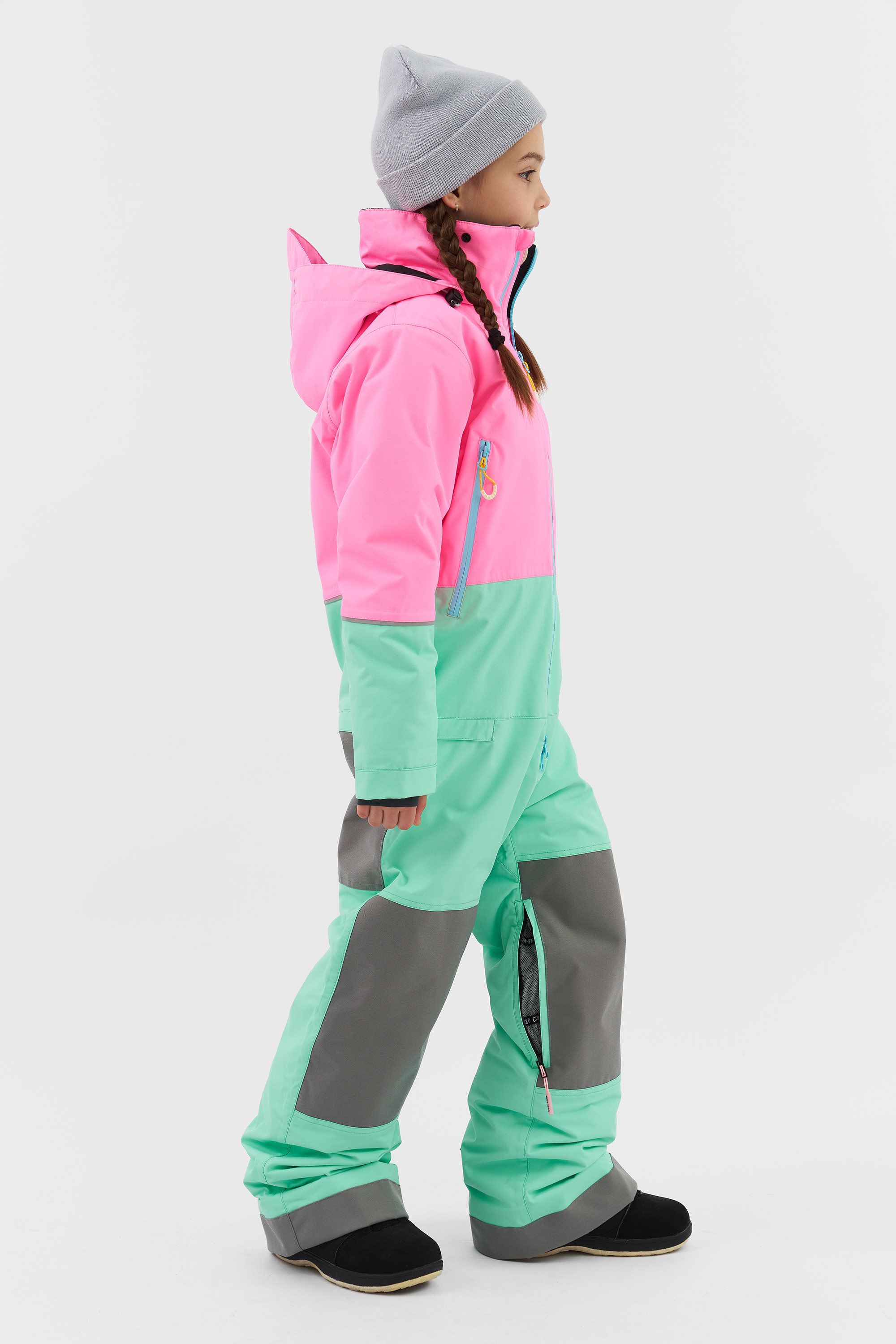 В отличие от раздельной экипировки, цельный зимний комбинезон обеспечивает непрерывную защиту от холода и снега, удерживает тепло и не позволяет ветру проникать внутрь. Это особенно важно во время катания на сноуборде или лыжах, когда ребёнок активно двигается и часто оказывается в снегу.