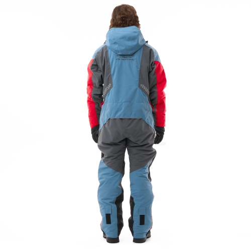 Этот теплый мужской комбинезон синего цвета с красными и серыми элементами предназначен для снегохода, сноубайка и сноуборда. Надежно защитит от ледяного ветра и мокрого снега: ткань верха содержит водоотталкивающее покрытие. Внешние молнии влагозащитные. Проклеены все швы. При закрытой вентиляции и карманах комбинезон герметичен.