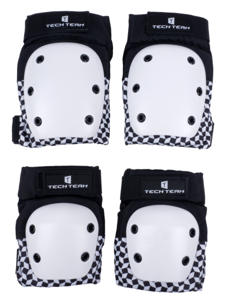 Комплект защиты Tech Team BASIC M2 white - прочные износостойкие наколенники и налокотники для катания на трюковом самокате, скейтборде, лонгборде, а так же на роликовых коньках. Жесткие щитки несъемные, с заклепками, отлично защищают от контакта с любыми поверхностями. На наколенниках и налокотниках можно скользить при падении, снижая тем самым риск получения травмы. Щитки выполнены из ударопрочного полипропилена, внешняя часть защиты - плотный нейлон, внутренняя - ударопоглощающая вставка EVA 21 мм и трикотажная подкладка. Сидит защита очень удобно за счет эргономичного кроя и комбинированной системы фиксации: эластичные чулки и эластичные регулируемые резинки на липучках. В комплекте идет сетчатый мешок для хранения.